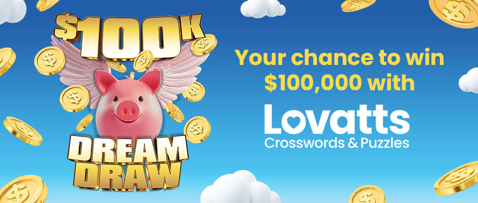 Competition opens 30/01/26 at 10:00 AM (AEDT) and closes 28/01/27 at 11:59 PM (AEDT). Open to Australian and New Zealand residents over the age of 16. One entry per Eligible Product Purchase featuring the $100K Dream Draw promotion defined in full terms. To enter, entrant must solve the puzzle and complete the online competition form. Subject to clause 18 of the full terms, a winner will be drawn for a chance to win the major prize on 02/02/27 at 10:00 AM (AEDT) at the Promoter’s premises at 100-102 Terrigal Esplanade, Terrigal, NSW 2260. The winner, or their proxy, will then select one (1) envelope from a pool of one hundred (100) on 04/03/27 at 11:00 AM (AEDT). There will be one envelope with the prize of AU$100,000 noted in it. The other envelopes will have AU$5,000 noted in each. The contents of the envelope picked by the winner or their proxy will determine the prize the winner wins. The total prize pool is valued at up to AU$100,000 (incl. GST). Winner will be notified by phone or email and published online at www.lovattspuzzles.com/major-prize-winners/ from 9/03/27 for a minimum of 28 days. The Promoter is Lovatts Media (ABN 99 003 314 681) of 100-102 Terrigal Esplanade, Terrigal, NSW 2260. Authorised under: NSW TP/04020; ACT TP 25/01819.1.