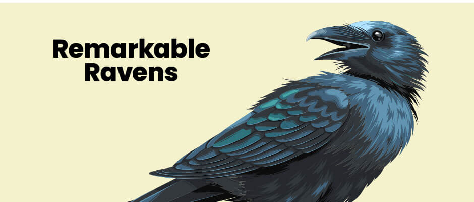 They can mimic the sounds of other birds and animals, even human voices. When hiding food from other ravens, a raven sometimes pretends to hide it in one spot, then deposits it elsewhere. However, other ravens are just as smart, so they can’t be easily deceived. There is evidence that ravens, perched on the roof of a supermarket in Canada, waited for people to pass so that they could push snow on them.