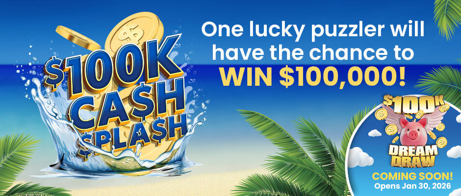 Competition opens 31/01/25 at 10:00 AM (AEDT) and closes 29/01/26 at 11:59 AM (AEDT). Open to Australian and New Zealand residents over the age of 16. One entry per Eligible Product Purchase featuring the $100K Cash Splash promotion defined in full terms. To enter, entrant must solve the puzzle and complete the online competition form. Subject to clause 18 of the full terms, a winner will be drawn for a chance to win the major prize on 05/02/26 at 10:00 AM (AEDT) at the Promoter’s premises at 100-102 Terrigal Esplanade, Terrigal, NSW 2260. The winner, or their proxy, will then select one (1) envelope from a pool of one hundred (100) on 05/03/26 at 11:00 AM (AEDT). There will be one envelope with the prize of AU$100,000 noted in it. The other envelopes will have AU$5,000 noted in each. The contents of the envelope picked by the winner or their proxy will determine the prize the winner wins. The total prize pool is valued at up to AU$100,000 (incl. GST). Winner will be notified by phone or email and published online at www.lovattspuzzles.com/major-prize-winners/ from 10/03/26 for a minimum of 28 days. The Promoter is Lovatts Media (ABN 99 003 314 681) of 100-102 Terrigal Esplanade, Terrigal, NSW 2260. Authorised under: NSW TP/01653; ACT TP 24/02112; SA T24/1621.